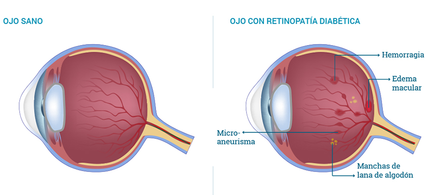 Con el mantenimiento de elevados niveles de glucemia, las paredes de los vasos retinianos se alteran y se vuelven más permeables, dejando pasar fluido al espacio extracelular. En casos más avanzados, se produce una proliferación de vasos sanguíneos anómalos que originan hemorragias. La presencia de sangre en el espacio vítreo (un gel transparente que rellena el globo ocular), hace que éste se vuelva opaco, causando una disminución de la visión que en general se produce de forma brusca.